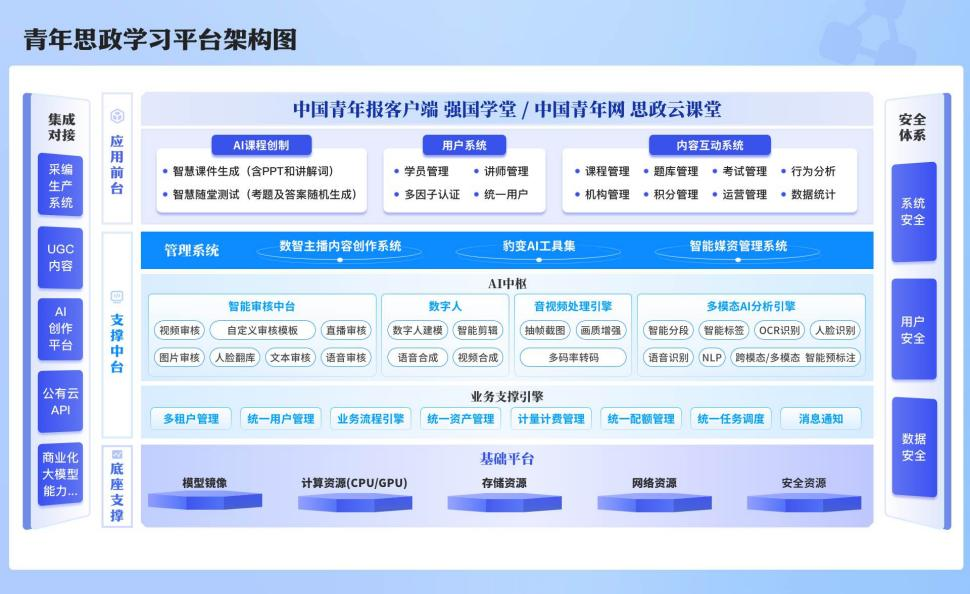 青年思政学习平台是中国青年报为践行“青年思想引领”主责主业打造的网络正能量传播阵地;是中国青年报推进新一轮可视化“人机协同·智慧生态”系统性变革,以新技术赋能采编生产的创新举措;是以中国青年报客户端为主要载体,内容贯通报、网、端,综合打造的汇集高校思政课程、中学生入团课程、党史和时政课程等多种内容、渠道、活动的学习型产品。平台可实现多层级的青年组织相关活动的直播、互动等视频支持;实现课程产品的多渠道、多平台、多屏、多码流和多种清晰度的分发,配合中国青年报“功能性直播”,以文化新业态服务,给青年更温暖的链接。同时,还可实现基于用户学习数据分析的内容精准化推荐和学习效果的智能测评,全方位帮助青年增长智慧。系统建设目标是按照中央要求,触达、沟通、引领具有“国之大者”情怀的90后、00后,陪伴、帮他们成长为具有“中国价值、国际视野、人类情怀”的一代。