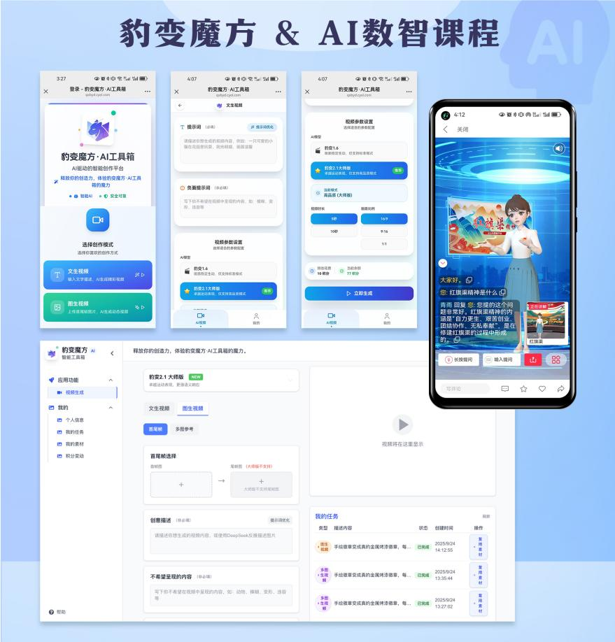 授课教师在课程管理端,可使用智能课程制作工具,输入图、文、网页资料、音视频资料,根据课程主题设定课件PPT生成页数、结构、受众群体、应用场景、语气、语言类型,通过大模型生成可视化智能课件大纲和课程讲解词。同时还支持图文资料导入生成PPT课件,文件格式支持word、pdf、ppt、xmind等,可将其内容梳理成大纲进行智能生成。豹变魔方·工具箱支持多模态内容生成。