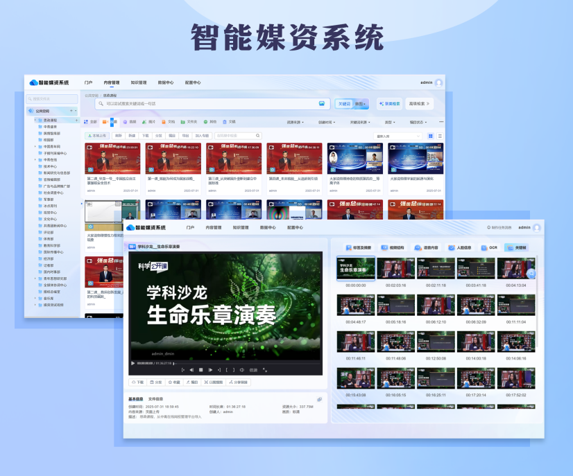 平台所用到的视频、案例素材等课程资源通过统一入口汇聚,并依照统一标准集中存储和管理,确保内容清晰有序、可控可追溯。通过智能审核、数据聚类、人物库、本地标签管理和跨模态向量检索等功能模块,进一步激活资源数据,挖掘出青年思政课程深层次的应用价值。系统采用“数据中台+能力中台”的双架构模式,数据中台为青年思政课程提供存储管理,包含建设课程特色标签体系、多种内容管理方式、高效的检索与利用、数据统计分析等;能力中台聚焦于智能能力的支撑,通过语音识别、人脸识别、OCR识别、视频分段、向量化分析等功能,对资源进行深度解析,两者协同实现了对课程资源智能化的存、管、用。