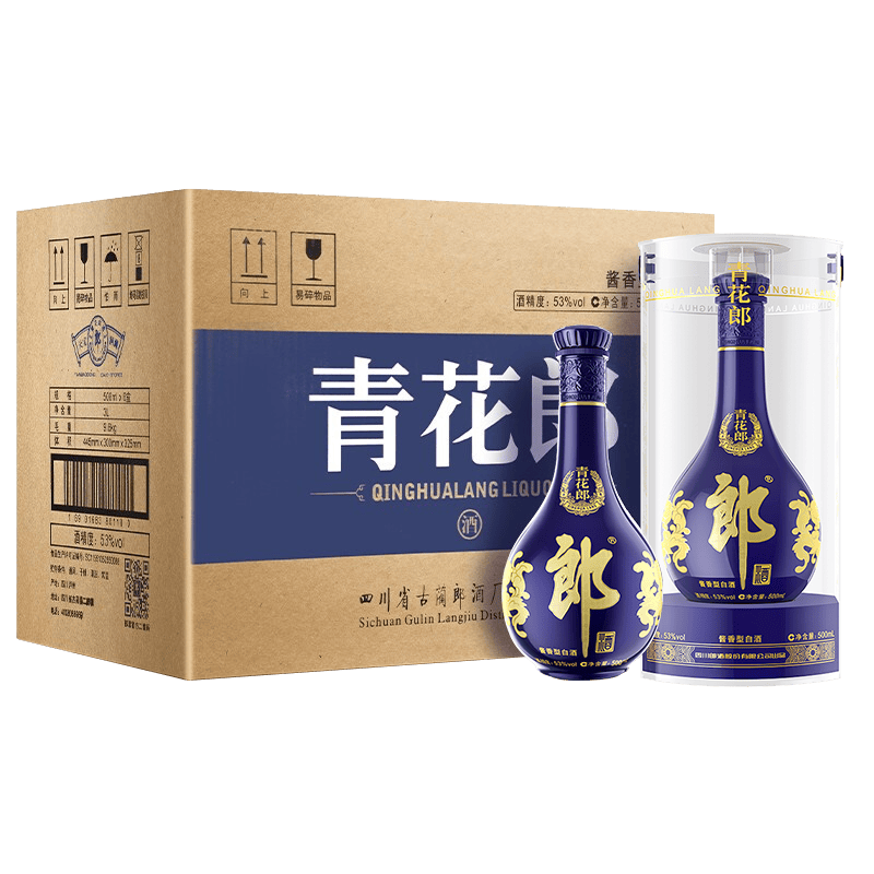 郎酒青花郎:53度,500ml*6整箱装,荣获‘世界烈酒大赛双金奖’,以其酱香突出和陈酿工艺而著称,适合收藏与高端宴请。
