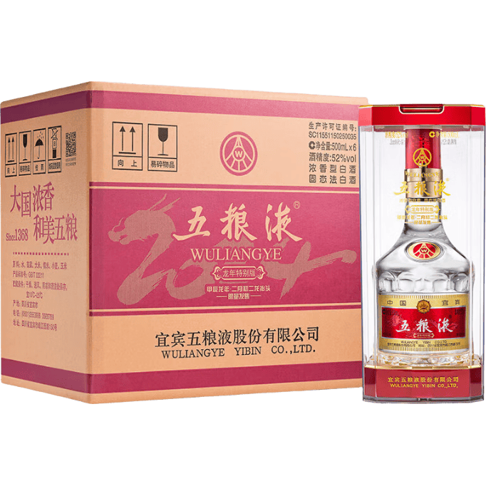 五粮液龙年特别版:52度,500ml*6原箱,采用精美礼盒包装,红色与金色的设计显得高贵典雅,适合送礼和庆祝场合。