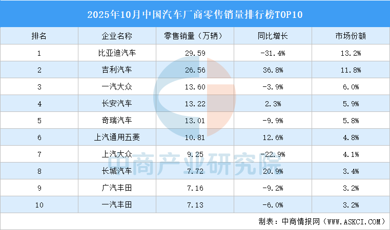 中商情报网讯:2025年10月,轿车零售销量前十厂商零售销量算计138.05万辆,商场占有率算计61.4%。比亚迪轿车零售销量最高达29.59万辆,商场占有率13.2%。吉祥轿车、一汽群众排名第二和第三,零售销量分别为26.56万辆、13.60万辆,商场占有率分别为11.8%、6.0%。长安轿车、奇瑞轿车、上汽通用五菱、上汽群众、长城轿车、广汽丰田、一汽丰田进入前十,顺次排名第4-10名。